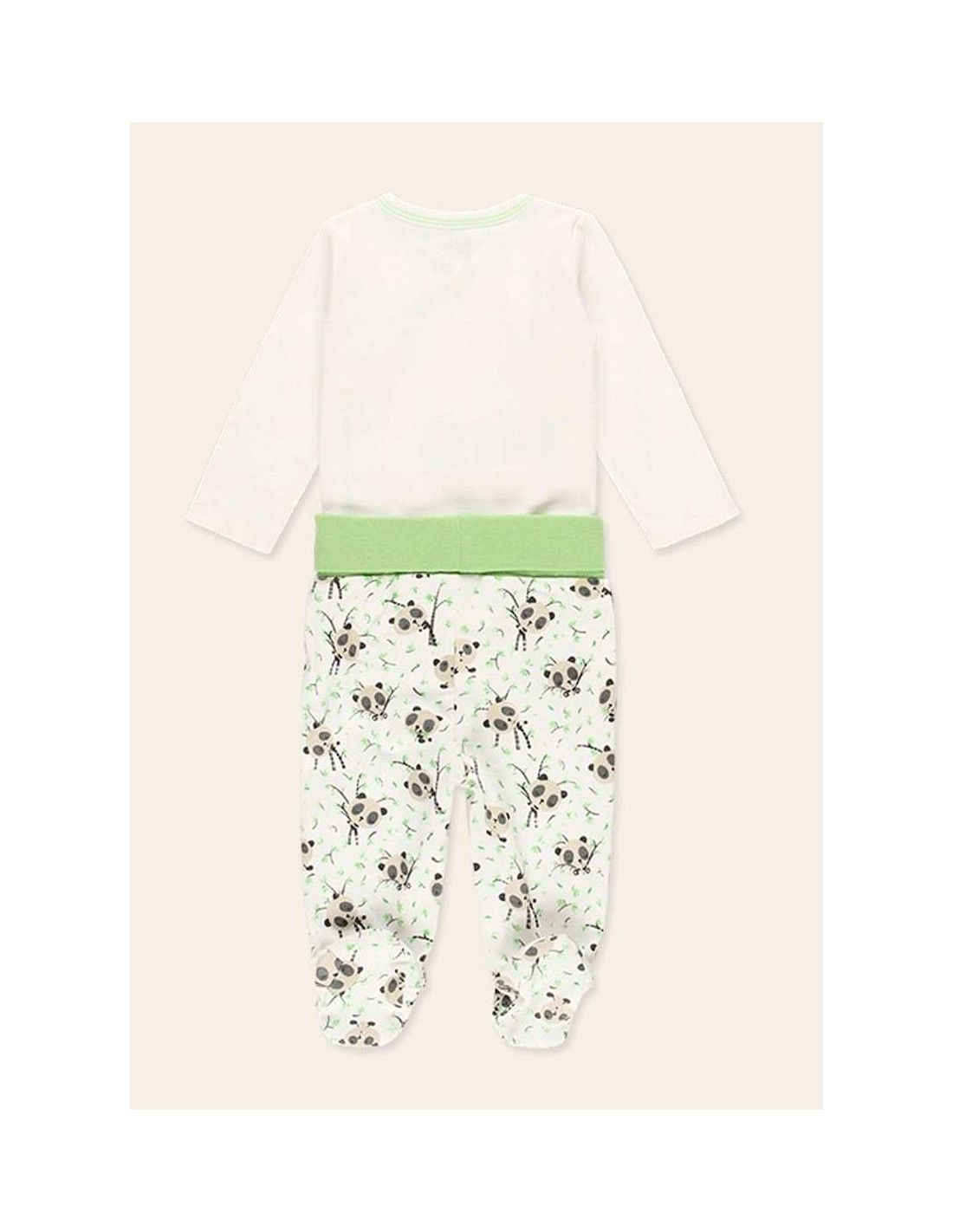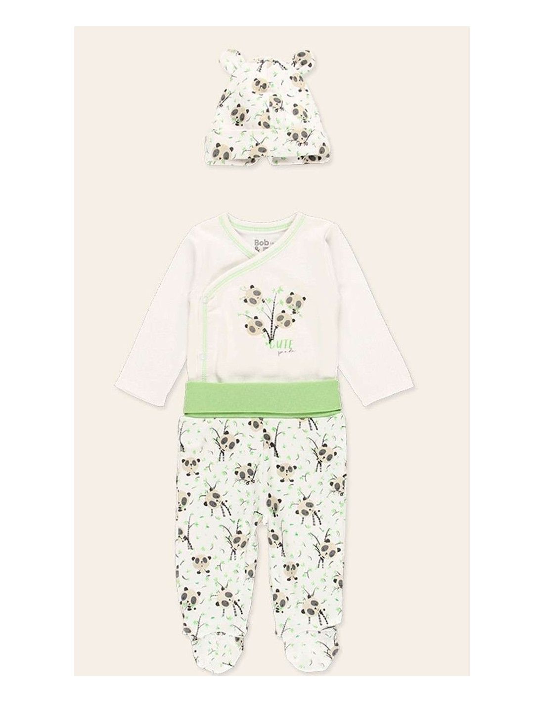Pack de tres piezas de bebé unisex en canalé orgánico. Body en color blanco con estampado en el centro de osos panda y letras, va abrochado por delante con cierres a presión. Polaina de color blanco con estampado de osos panda y bambú, lleva la cinturilla de canalé 1X1 en color verde. Gorro en color blanco con estampado de osos panda y bambú, lleva orejitas en la parte de arriba del gorro.
