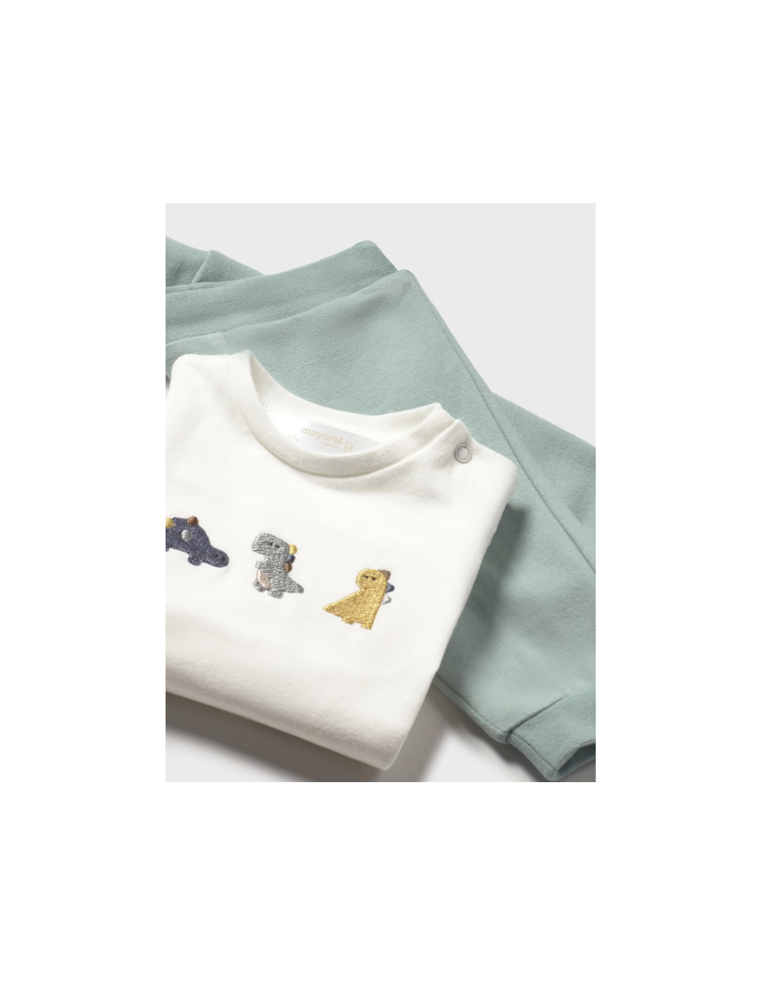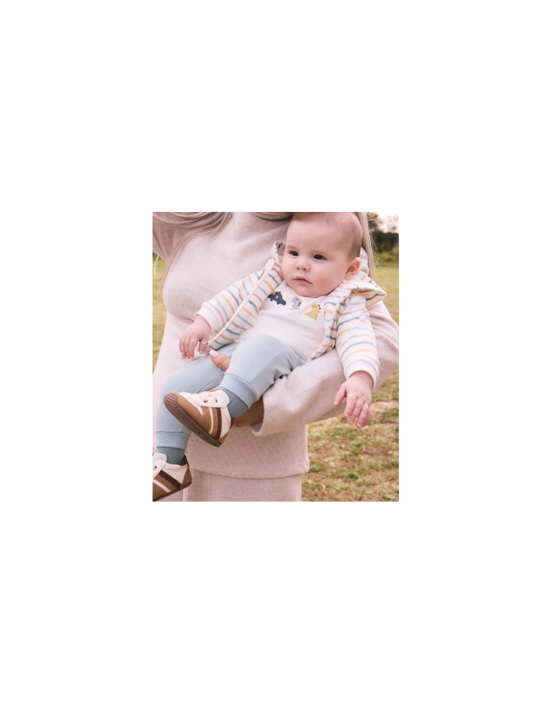 Canguro de manga larga para recién nacido. Cuello con capucha. Cierre central delantero con cremallera. Bolsillo lateral. Elementos de adorno: apliques decorativos, bordado, botón decorativo. Motivo de rayas. Camiseta de manga larga para recién nacido. Cuello redondo. Botón a presión en el hombro para facilitar la puesta de la prenda. Elementos de adorno: aplique decorativo, bordado. Pantalón largo deportivo para recién nacido de gran confort. Cinturilla elástica. Bajo elástico para un mejor ajuste.