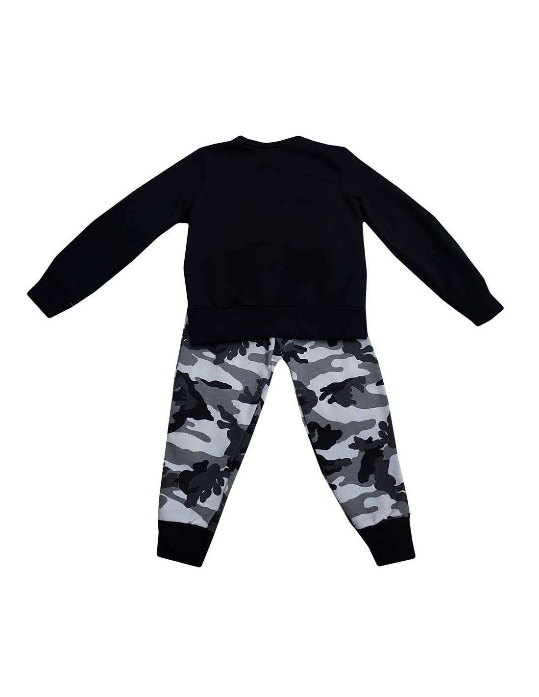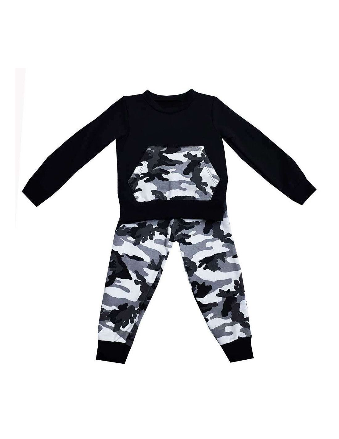 Conjunto dos piezas para niño. Sudadera con bolsillo canguro .Pantalón con goma y cordón para ajustar. Dibujo militar.