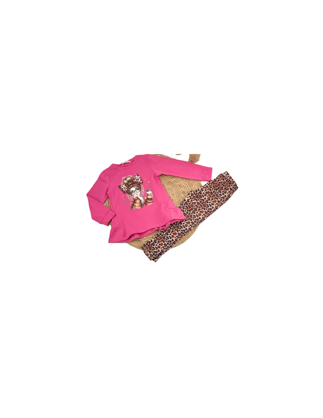 Sudadera de manga larga para niña. Cuello redondo. Cómodo tejido de felpa tacto gustoso y suave. Pantalón leopardo tipo leggins. Goma elástica en la cintura para un mejor ajuste.
