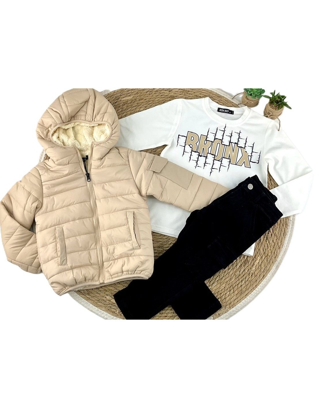 Conjunto de tres piezas para niño compuesto por una camiseta, un pantalón largo y una chaqueta a juego.