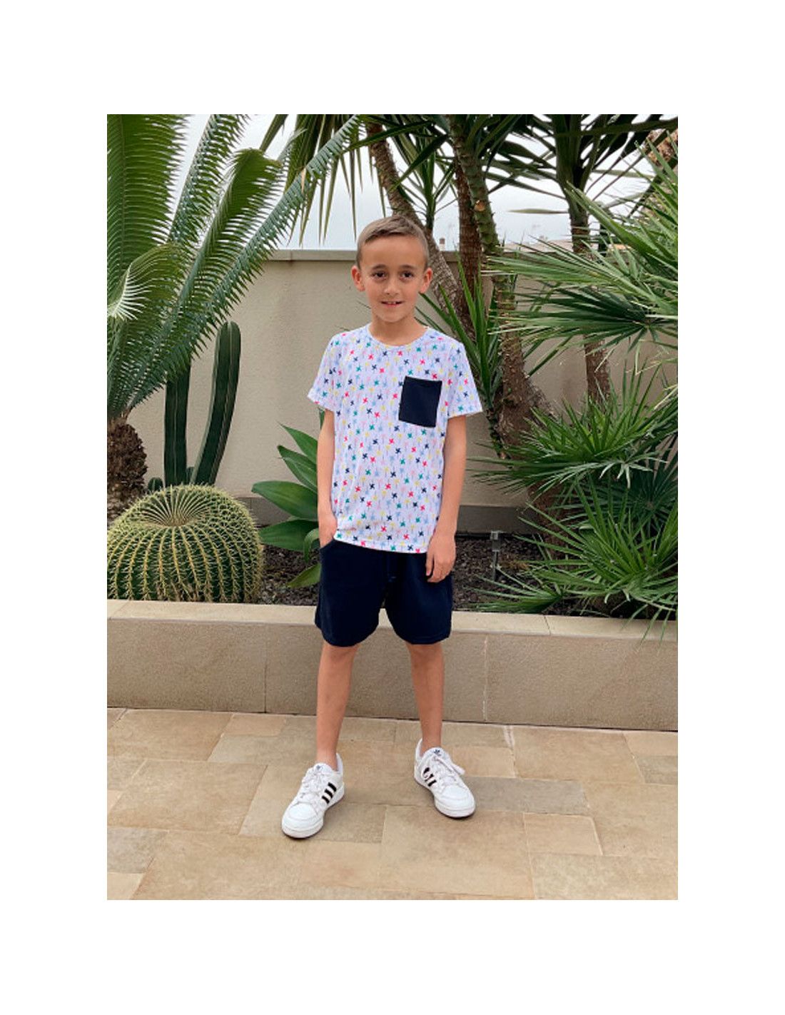 Conjunto de camiseta y bermuda combinadas para niño. Camiseta de manga corta con bolsillo para niño. Cuello redondo. Pantalón de tipo bermuda para niño. Cintura elástica con cordón ajustable. Bolsillos funcionales.